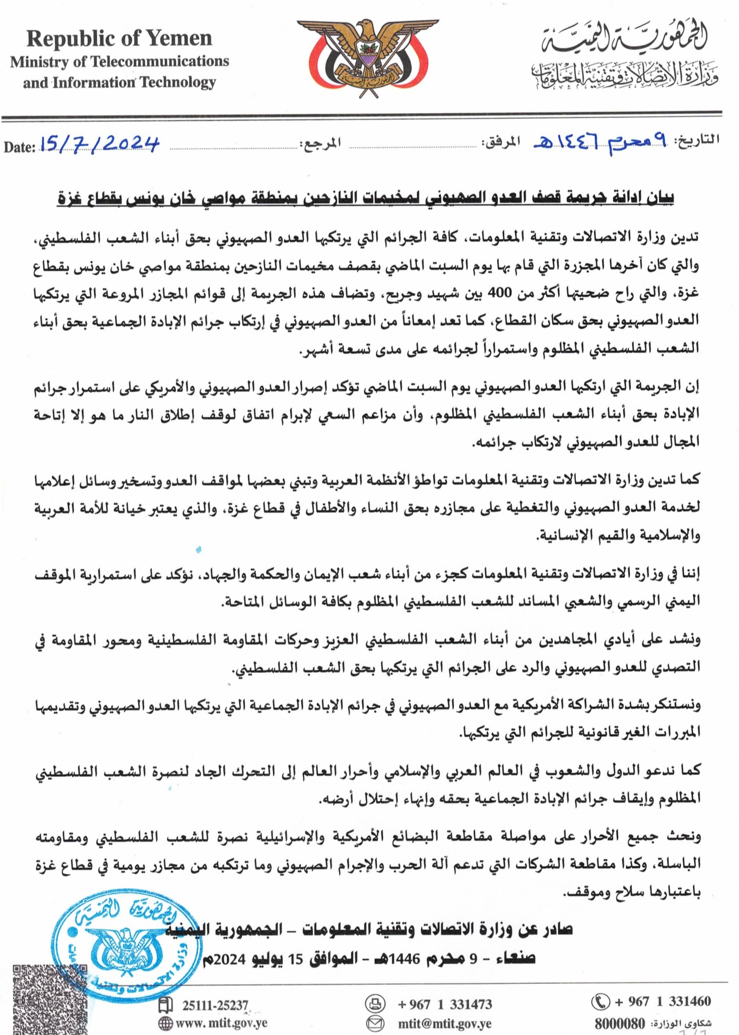 إننا في وزارة الاتصالات وتقنية المعلومات كجزء من أبناء شعب الإيمان والحكمة والجهاد، نؤكد على استمرارية الموقف اليمني الرسمي والشعبي المساند للشعب الفلسطيني المظلوم بكافة الوسائل المتاحة.