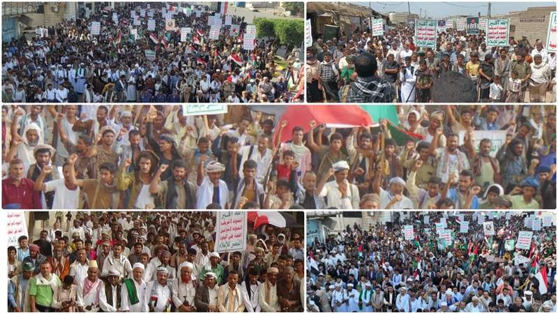وأهابت المسيرات بكافة أبناء الشعب اليمني، الاستعداد والجهوزية الكاملة للاستنفار الأكبر لنصرة الوطن ومواجهة العدوان الامريكي البريطاني وكل احتمالات التصعيد والتهديدات المحتملة في سبيل عزة وكرامة اليمن والمبادئ التي يناضل أبناء الشعب من أجلها للخروج من الوصاية الأمريكية والانتصار للقضية الفلسطينية.