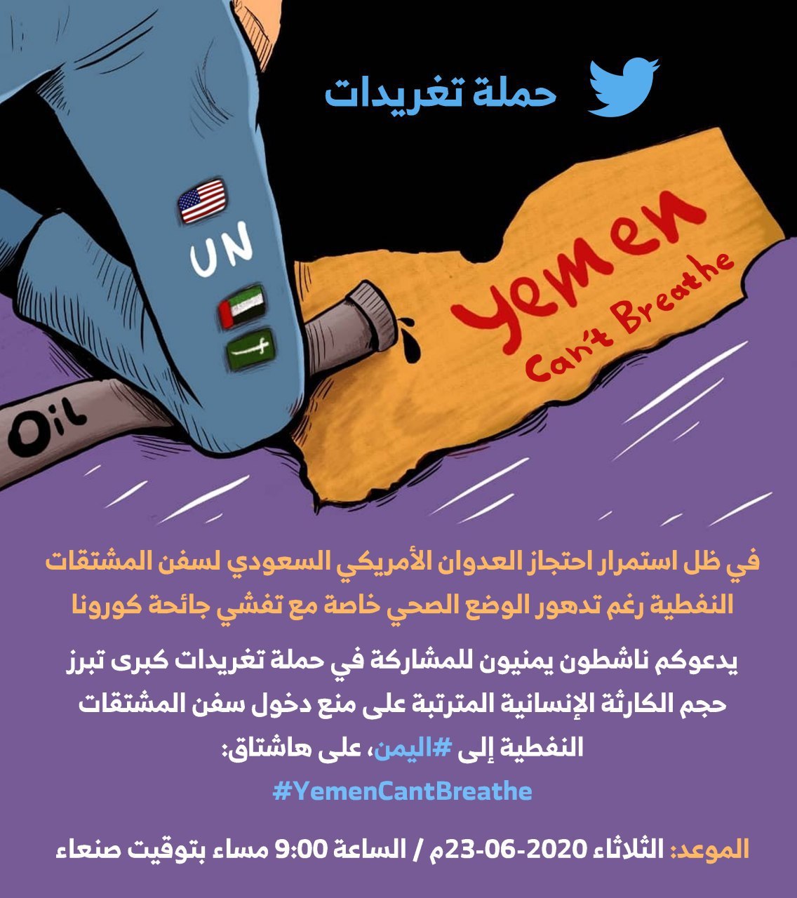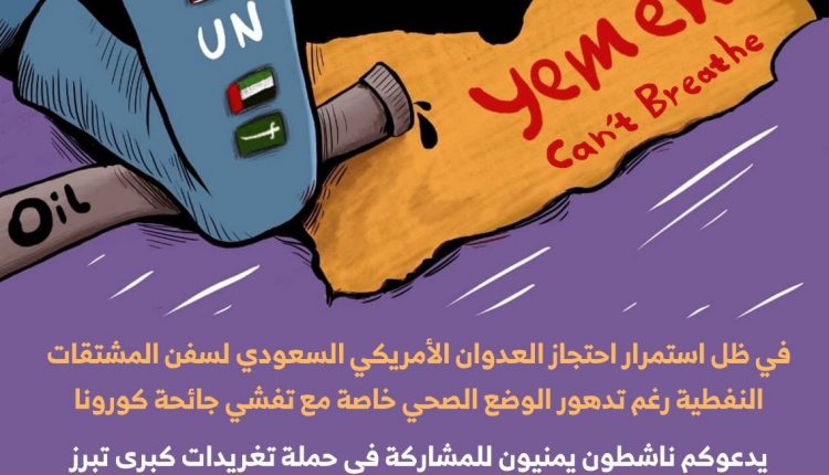 وأكد الناشطون ضرورة المشاركة في حملة التغريدات التي تنطلق الساعة التاسعة من مساء الثلاثاء المقبل، في ظل استمرار العدوان الأمريكي السعودي في احتجاز سفن المشتقات النفطية، رغم تدهور الوضع الصحي خاصة مع تفشي جائحة كورونا على هاشتاق: