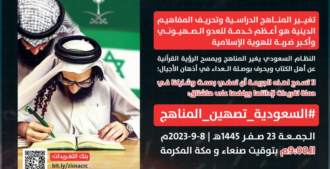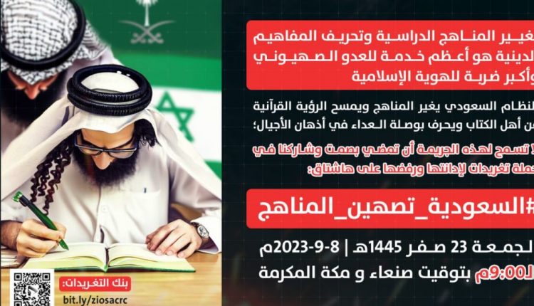 وأوضح منظمو الحملة أن النظام السعودي يغير المناهج ويمسح الرؤية القرآنية عن أهل الكتاب ويحرف بوصلة العداء في أذهان الأجيال، مشيرين إلى أن تغيير المناهج الدراسية وتحريف المفاهيم الدينية هو أعظم خدمة للعدو الصهيوني وأكبر ضربة للهوية الإسلامية.