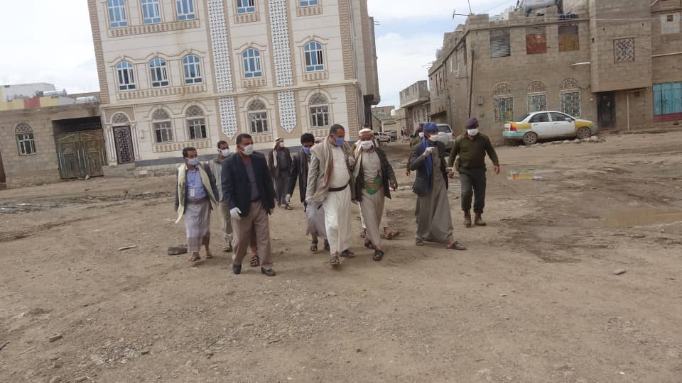 زار مدير عام مديرية بني الحارث الشيخ حمد بن راكان الشريف برفقة وكيل الأمانة الاستاذ علي اللاحجي ومدير مكتب الصحة بالمديرية منطقة الحجر الصحي بحارة غول القاضي بحي بني حوات مديرية بني الحارث
