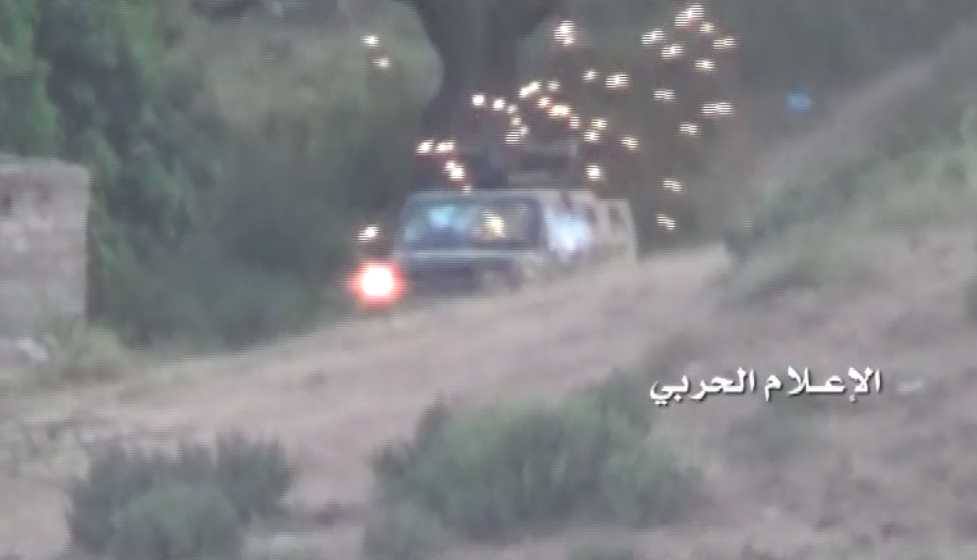 كما يظهر أيضا طقم عسكري بعد إعطابه وعملية استهدافه بأسلحة رشاشة.