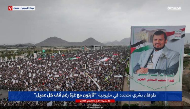 طوفان مليوني متجدد في صنعاء إسنادا لفلسطين تحت شعار (ثابتون مع غزة رغم أنف كل عميل)