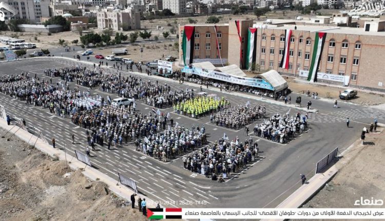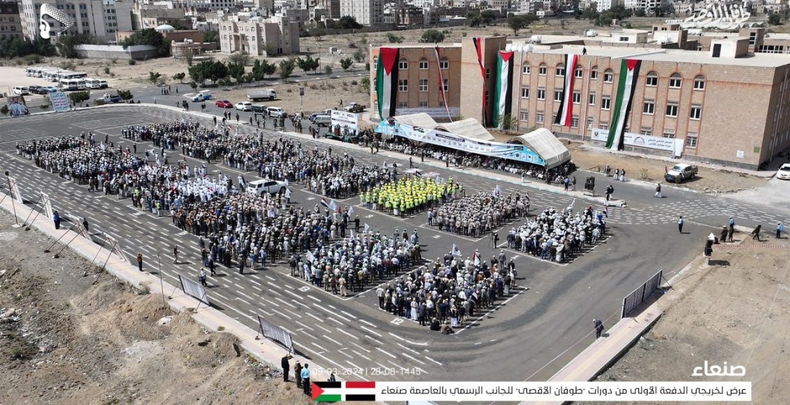 شهدت العاصمة صنعاء اليوم السبت ، عرضاً عسكرياً لأكثر من ألفين مقاتل من خريجي الدورات العسكرية المفتوحة “طوفان الأقصى” لقوات التعبئة العامة من الجانب الرسمي، الدفعة الأولى، ضمن الاستعداد للمشاركة في ” معركة الفتح الموعود والجهاد المقدس”.