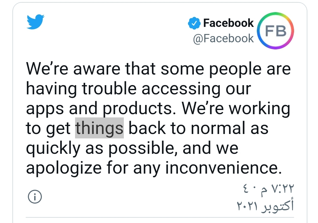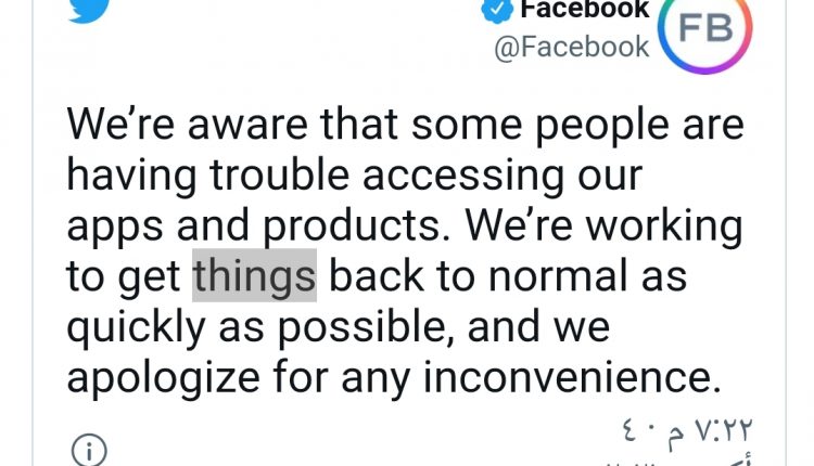 وأوضح موقع “فيسبوك” في تغريدة على “تويتر” أنه “يدرك أن بعض الأشخاص يواجهون مشكلة في الوصول إلى تطبيقاتنا ومنتجاتنا”، مضيفا “نحن نعمل على إعادة الأمور إلى طبيعتها في أسرع وقت ممكن، ونأسف لأي إزعاج”.