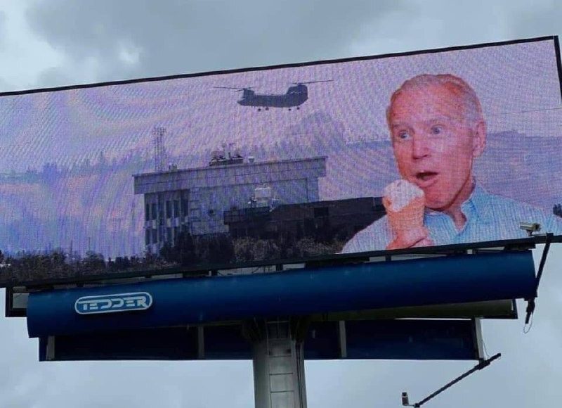 وقام المتهكمون بتحميل ميمات مع بايدن حول الوضع في أفغانستان، وظهرت على اللوحات الإعلانية صور تعبيرية، بدا في إحداها الرئيس الأمريكي ممسكا بآيس كريم وهو يحملق في مشهد شهير لمروحية عسكرية أمريكية في مطار كابل أثناء عمليات إجلاء الأمريكيين من المدينة.