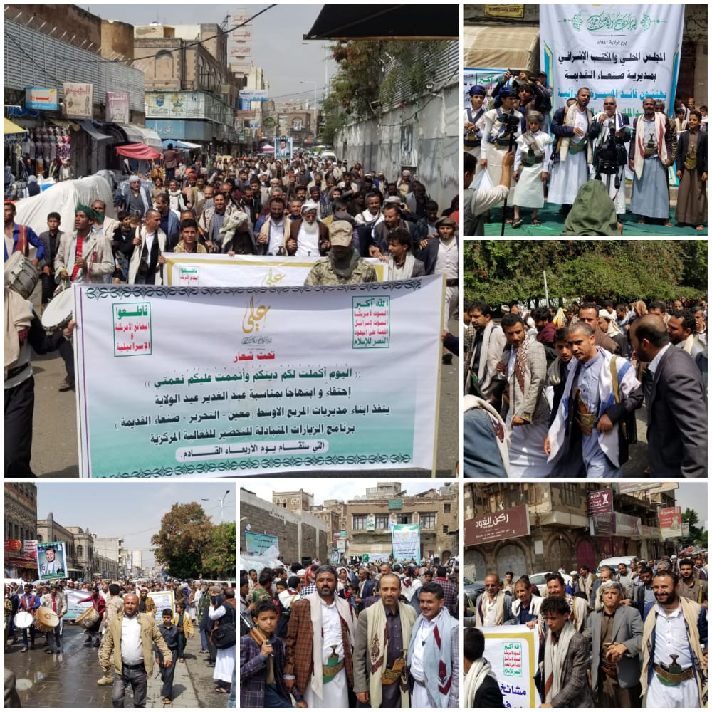 وتحت شعار ( اليوم أكملت لكم دينكم وأتممت عليكم نعمتي ) وبحضور ومشاركة الأستاذ خالد المداني وكيل أول أمانة العاصمة والأستاذ سامي شرف الدين الوكيل المساعد لقطاع الوحدات الإدارية مشرف عام مديرية معين والعقيد مهدي عرهب مدير عام مديرية صنعاء القديمة والمهندس عبداللطيف الولي مشرف عام مديرية التحرير احيا أبناء مديريات مربع الوسط بأمانة العاصمة ( معين – التحرير – صنعاء القديمة ) صباح يومنا هذا الأثنين الموافق 26 يوليو 2021م فعالية استقبال ذكرى يوم عيد ولاية الأمام علي بن أبي طالب عليه السلام .