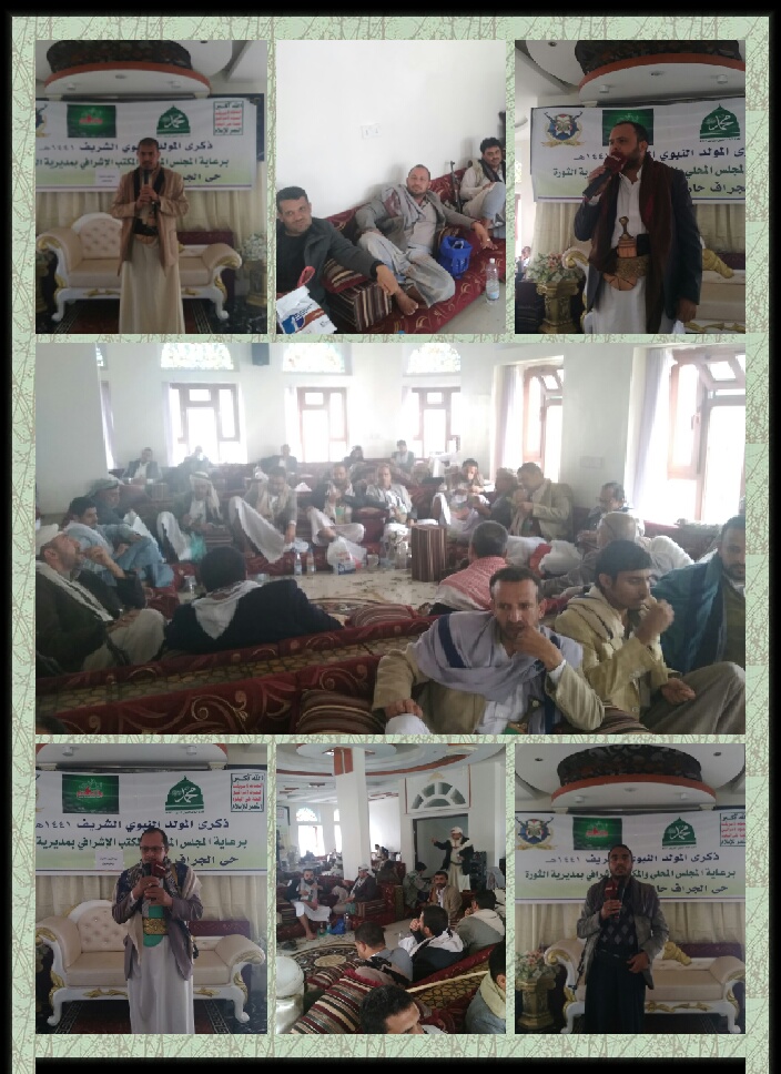 دشن حي الجراف بمديرية الثورة الفعاليات الثقافية و اللقاءات الموسعة في الأحياء والحارات بمناسبة ذكرى المولد النبوي الشريف ١٤٤١ه والذي يقام برعاية المجلس المحلي والمكتب الإشرافي بالمديرية . وأقيمت اليوم الأربعاء ١٦ / ١٠ / ٢٠١٩م الموافق ١٧ صفر ١٤٤١ه فعالية ثقافية ولقاء موسع بحي الجراف بحارتي عبدالقيوم والحيارة تدشينا لهذه اللقاءات بهذه المناسبة . وفي الفعالية الثقافية واللقاء الموسع الذي حضره مستشتر رئيس الجمهورية السفير عبدالإله حجر و عضو مجلس النواب الشيخ محمد حميد الطوقي وعضو مجلس الشورى اللواء يحي المهدي ومدير عام صندوق النظافة بالأمانة محمد شرف الدين ومدير عام مديرية الثورة محمد حمود الدرواني ونائب رئيس فرع الدائرة ١٧ للمؤتمر الشعبي العام صادق مشرف ونائب مدير المنطقة الأمنية بالمديرية ابوالهادي الهادي واجتماعي المديرية العميد هاشم إبراهيم ومشرف حي الجراف ابوحسين جزيلان والمشرف الثقافي بالمديرية خالد سليمان وشيخ المديرية محمد مداعس ونائب المنطقة التعليمية بالمديرية محمد المأخذي وعلي الكحلاني وعبدالمنعم الجرافي وعدد من مدراء المكاتب التنفيذية . وأشار عضو مجلس الشورى اللواء يحي المهدي إلى أهمية إعداد أنفسنا وتجهيزها ونحن نستلهم الدروس من حياة رسولنا الكريم والعبر من مواقفه في حياته الشريفة في السير على نهجه ومنواله وإقتفاء أثره وخطاه في كل امور حياتنا . واستغرب من سير الأمة على نهج اعداها وهم يحتفلون بأعياد متنوعة على مدار العام من عيد الحب ( الفلنتاين ) وعيد الشجرة والكرسمس وإقامة عيد الميلاد للأبناء أو الطاعنين في السن ولكن عند احتفالنا بالمولد النبوي الشريف صلوات الله وسلامه عليه وعلى آله يصبح الامر بدعة . ودعا المهدي إلى ضرورة وأهمية إظهار مظاهر الاحتفال بالمولد النبوي الشريف في شوارعنا ومنازلنا وكل أمور حياتنا بما يغيض أعدائنا ويظهر للعالم أجمع مدى حب اليمنيين لرسولهم الذي أخرج الأمة من ظلام الكفر إلى نور الهداية . وأكد على أهمية تهيئة الناس للخروج الحاشد في الفعالية المركزية وفي كل المحافظات وفي وقت واحد وزمن واحد وهم يقولون ” لبيك يا رسول الله ” . وأضاف لا ينبغي أن ننسى أولئك المسبحين من المجاهدين في الجبهات وهم يحتفلون بالمولد النبوي الشريف على طريقتهم وهم يقدمون ارواحهم ودمائهم وحياتهم في سبيل الله وحبا لرسوله الكريم . ولفت إلى أن اليمنيين رجال تواقون للسلام السلام العادل المشرف الذي يحفظ لهم عزتهم وكرامتهم ودمائهم وأعراضهم التي صانها الرسول الكريم وحفظها وإن كانوا يريدوا قتالا فنحن اهله فاليوم نضرب عمق دول العدوان . وقال مشرف حي الجراف ابو حسين جزيلان أن النبي المصطفى جاء رحمة للعالمين وأن مشروعية الاحتفال بمولده جاءت من شرعية القرآن الكريم وهم ينظرون لإجتماع الأمة خلف نبيها والإقتفاء لأثره وخطاه ومنهجه الرباني يعد خطرا عليهم وهو ما صرح به أحد حخامات اليهود في القناة الإسرائيلية العاشرة . واستغرب من مظاهر الاحتفال للدول العربية بالكرسمس وما قامت به الإمارات من بذخ احتفالي بالكرسمس وتزيين الطائرات والابراج في حين يصبح الاحتفال بمولد الحبيب المصطفى بدعة . واضاف عندما نحتفي ونحتفل بالمولد النبوي الشريف إنما هو احياء لصفاته الكريمة وشمائله ومواقفه . من جانبه أكد مدير عام مديرية الثورة محمد حمود الدرواني في تصريح إعلامي على أهمية التجهيز والتحضير للفعالية المركزية لذكرى المولد النبوي الشريف ١٤٤١ه . وأشار إلى أن المجلس المحلي والمكتب الإشرافي نظم برنامج للقاءات الموسعة لذكرى المولد النبوي الشريف في جميع حارات وأحياء المديرية وصولا للفعالية المركزية للمديرية قبيل الفعالية المركزية على مستوى الجمهورية . وأضاف بأن ذلك يأتي من خلال إدراكنا بعظمة هذه المناسبة لدى المسلمين عامة التي على صاحبها أفضل الصلاة والتسليم . ودعى الجميع من أبناء مديرية الثورة إلى الحشد للفعالية المركزية في الثاني عشر من ربيع الأول في حشد غير مسبوق يعك