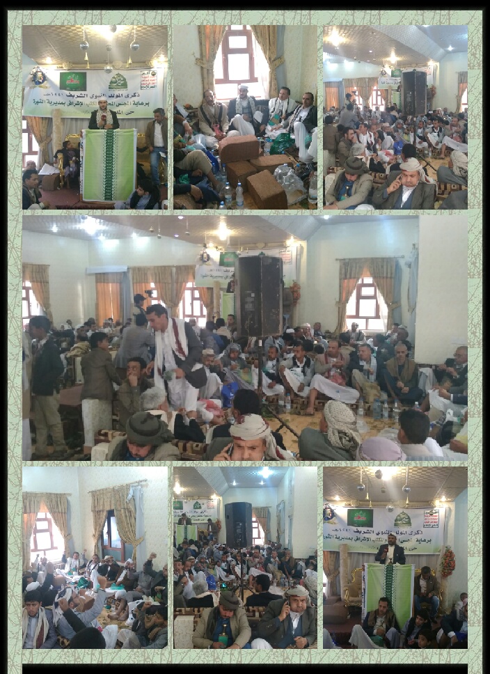 دشن حي الملعب بمديرية الثورة الفعاليات الثقافية و اللقاءات الموسعة في الأحياء والحارات بمناسبة ذكرى المولد النبوي الشريف ١٤٤١ه‍ والذي يقام برعاية المجلس المحلي والمكتب الإشرافي بالمديرية .  وأقيمت اليوم الجمعة ١٨ / ١٠ / ٢٠١٩م الموافق ١٩ صفر ١٤٤١ه‍ فعالية ثقافية ولقاء موسع بحي الملعب لحارتي المدينة الرياضية ومركز التدريب والذي حضره نائب وزير الزراعة والري ماجد المتوكل واعضاء رابطة علماء اليمن العلامة خالد موسى والعلامة طه الحاضري ومدير عام مديرية الثورة محمد حمود الدرواني ومشرف المديرية القاضي إبراهيم الكبسي واجتماعي المديرية هاشم إبراهيم والاستاذ علي الكحلاني ومشرف حي الملعب إسماعيل الكحلاني واجتماعي الحي محمد الشهراني وشيخ المديرية محمد حسين مداعس وعضو المجلس المحلي شيخ الحي محمد عبدالله مداعس .  من جانبه أكد مدير عام مديرية الثورة محمد حمود الدرواني في تصريح إعلامي على أهمية التجهيز والتحضير للفعالية المركزية لذكرى المولد النبوي الشريف ١٤٤١ه‍ .  وأشار إلى أن المجلس المحلي والمكتب الإشرافي نظم برنامج للقاءات الموسعة لذكرى المولد النبوي الشريف في جميع حارات وأحياء المديرية وصولا للفعالية المركزية للمديرية قبيل الفعالية المركزية على مستوى الجمهورية .  وأضاف بأن ذلك يأتي من خلال إدراكنا بعظمة هذه المناسبة لدى المسلمين عامة التي على صاحبها أفضل الصلاة والتسليم .  ودعى الجميع من أبناء مديرية الثورة إلى الحشد للفعالية المركزية في الثاني عشر من ربيع الأول في حشد غير مسبوق يعكس عظمة وحب اليمنيين لخاتم الأنبياء أمام العالم .  منبها إلى أهمية رفد الجبهات بالمال والرجال وهم يسطرون أروع الملاحم البطولية دفاعا عن الأرض والعرض .  وقال عضو رابطة علماء اليمن العلامة خالد موسى بأن هذا الحضور تعبيرا عن الولاء الخالد والمتجدد لشريعته وإقدامه وقيمه مذكرا بموقف أجدادنا الذي استقبلوه عند مقدمه من مكة للمدنية المنورة ونحن اليوم نستقبل ونستهل المولد النبوي منذ احتفائنا بيوم الهجرة النبوية الشريفة منذ مطلع العام الهجري .  وقال شتان ما بين من يعترفوا وهم مقرين ببيع انفسهم لأمريكا وإسرائيل وبين من يبيعون انفسهم لله وحبا لرسوله في الجبهات بذلا وعطاء وتضحية وهم يترجمون اخلاق رسوله في الأسرى الخائف يطمنونه والجائع يشبعونه والجريح جراحه .  وأكد بأن المولد النبوي الشريف يمثل فرصة سانحة لنزود أنفسنا بالهداية من الوقوع في مستنقعات الإنحراف فمن خلاله نزداد وعيا وبصيرة .  وأضاف بأن المولد النبوي الشريف يمثل فرصة سانحة لمواجهة الحرب الناعمة والغزو الذي يغزوا بيوتنا ومجتمعاتنا ومواجهة هذه الجاهلية .  وأكد على أن مواجهة الحرب الناعمة والإعلام المضلل الذي يفقد أبنائنا نخوتهم وشجاعتهم وإقدامهم أخطر من الحرب العسكرية ومواجهة حرب التغريب وتغريب الدين .  وقال إذا كنا سنخرج لتنظيف شوارعنا من القاذورات فعلينا أن ننظف مؤسسات الدولة من الفاسدين والكسالى ومن لا يقدرون تضحيات المجاهدين في الجبهات وتفعيل الرقابة الحكومية والرقابة الشعبية .  وطالب بالعودة إلى تربية الأمة تربويا وسياسيا وعسكريا فنحن نريد دولة قوية عادلة .  بدوره أشار عضو رابطة علماء اليمن العلامة طه الحاضري إلى سر عداوة اليهود لميلاد الرسول ولرسالته وأنهم سكنوا جزيرة العرب وتكاثروا فيها استعدادا لمناصرة الرسول القادم فحين جاء عربيا فأنكروا ذلك وكان اليمنيين من الأوس والخزرج سباقين لاتباعه فقد عرفوه من خلال وصف اليهود لصفاته .  وأكد أننا بحب رسوله واتباع أثره ومناقبه وحياته نستطيع مواجهة الحرب الناعمة والحرب الإقتصادية والحرب العسكرية وحرب الأدمغة وكل الحرب .  وقال علينا أن نخرج خروجا حاشدا يمثل رسالة واضحة للعدوان ورسالة سلام للعالم أجمع   وأشار عبدالرحيم الشرفي في كلمة الترحيب بأن الله كرم الأمة برسولها الكريم وكرم اليمنيين بحب رسول الله وأن اليمنيين رفضوا حصار الرسول في غزوة الأحزاب بالمدينية حين 