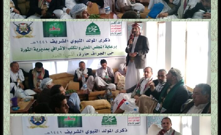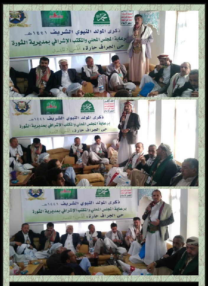 نظمت مديرية الثورة فعاليتين ثقافيتين بمناسبة ذكرى المولد النبوي الشريف على صاحبه افضل الصلاة وأتم التسليم . وفي الفعالية الأولى التي نظمتها حكومة الشباب والجانب الأمني بالحصبة الجنوبية برعاية المجلس المحلي لمديرية الثورة والتي حضرها عضو مجلس النواب الشيخ محمد حميد الطوقي ووكيل أمانة العاصمة ناجي القوسي ومدير عام الشئون الاجتماعية بالأمانة ناصر الكاهلي ومدير عام مديرية الثورة . واشار وكيل الأمانة المساعد لقطاع الأشغال المهندس عبدالكريم الحوثي في كلمته بفعالتي مديرية الثورة إلى عظمة المناسبة بذكرى مولد أشرف خلق الله محمد صلى الله عليه وعلى آله . وأكد على اهمية الخروح الحاشد والفاعل لأبناء اليمن في الثاني عشر من ربيع الأول للاحتفال بمولد خاتم الأنبياء والمرسلين في رسالة واضحة للعالم أجمع بمدى تعلق اليمنيين وارتباطهم برسولهم الكريم . مطالبا بتعزيز قيم الولاء والتضحية في سبيل الله ورسوله ونحن نتصدى للعدوان الغاشم الذي دخل عامه الخامس في اليمن . وفي الفعالية الثانية الذي نظمها المجلس المحلي والمكتب الإشرافي بمديرية الثورة والتي حضرها مستشار رئيس المجلس السياسي الأعلى السفير عبدالاله حجر وعضو مجلس النواب الطوقي وأشار مدير عام مديرية الثورة محمد حمود الدرواني إلى عظمة هذه المناسبة والعمل على الإعداد والخروج الحاشد لها لما يمثله من رسالة قوية للعالم بأن اليمنيين رسل محبة وسلام وأن وفائهم وعهدهم لرسول الأمة سيظل مغروسا في قلوبهم . ولفت إلى استعدادات المجلس المحلي لتنظيم فعاليته المركزية الثلاثاء المقبل . داعيا جميع ابناء المديرية للخروج الكبير وتزيين بيوتهم وشوارعهم ومحلاتهم بما يظهر عظمة المناسبة وفرحة ابناء المديرية والعاصمة عموما بذكرى مولده الشريف . اشارت باقي الكلمات للقاضي إبراهيم الكبسي وأكرم جزيلان وحسين شرف الدين ومحمد العماري إلى ضرورة التفاعل والحشد للفعالية المركزية واستعرضت عظمة الرسول الكريم الذي بعث رحمة ونور للعالمين واستنكرت الكلمات الدعوات الرامية لعدم الاحتفال بذكرى مولده وإدعائهم بأن الاحتفال به بدعه في حين لا يستنكرون فتح اماكن الفجور واللهو وهيئة الترفيه وفتح المراقص . تخلل الفعاليتين قصائد شعرية وفقرات من التراث اليمني نالت استحسان الحاضرين.