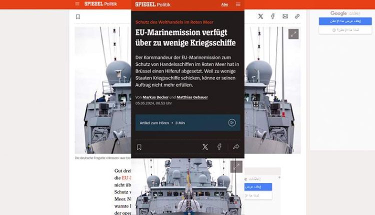 وقالت صحيفة دير شبيغل الألمانية نقلاً عن دبلوماسيين أوروبيين: لقد فشلت مهمة “أسبيدس” والعملية الموازية التي تقودها الولايات المتحدة في البحر الأحمر.