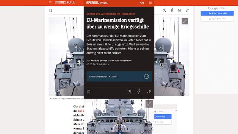 كشفت صحيفة ألمانية أنه، بعد مرور ثلاثة أشهر على إطلاقها، لم يعد لدى مهمة الاتحاد الأوروبي “أسبيدس” “Eunavfor Aspides” ما يكفي من السفن الحربية في البحر الأحمر.