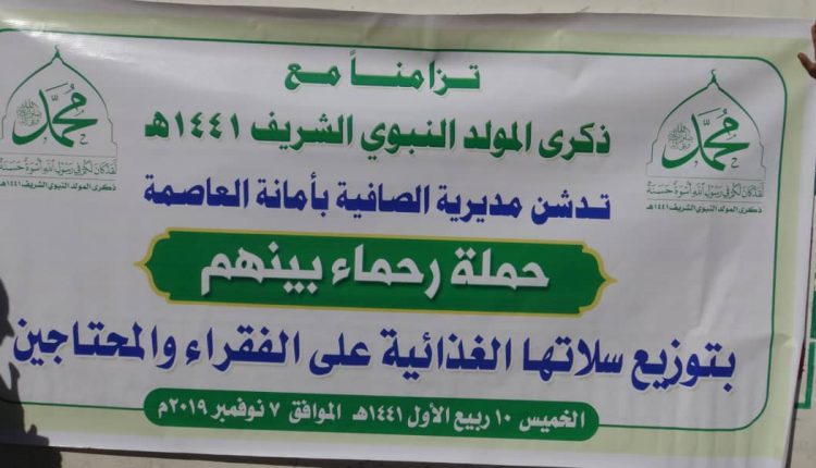 انطلقت صباح يومنا هذا الخميس قافلة بعنوان رحماء بينهم والتي انطلقت بمناسبة المولد النبوي الشريف ع صاحبة وآله افضل الصلوات وازكى التسليم والتي خصصت للفقراء والمساكين انطلقت الفعالية بفضل الله وببركة مولد نبية من مديرية الصافية امام مركز النور للمكفوفين الي ميدان السبعين الترابي حضر الانطلاق مستشار امين العاصمة محمد الحوثي ومشرف عام المديرية ومدير المديرية واعضاء المكتب الاشرافي والمكاتب التنفيذية وعقال ومتابعي الحارات والشخصيات الاجتماعية والتلاحم القبلي.