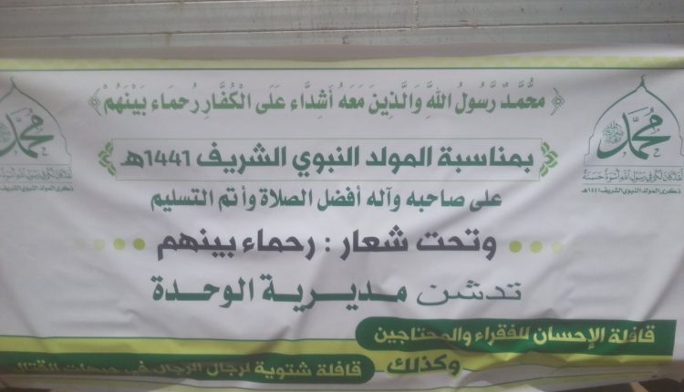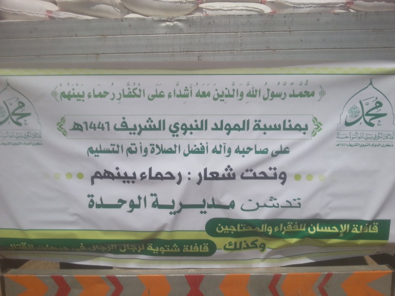 قدم ابناء مديرية الوحدة قافلة غذائية مكونه من اكثر 400 سلة غذائية وكمية كبيرة من الملابس الشتوية والبجائم ضمن قافلة كبرى لجميع مديريات الامانة حيث سيتم توزيعها للفقراء والمساكين بحلول مناسبة المولدالنبوي الشريف 1441 هـ.