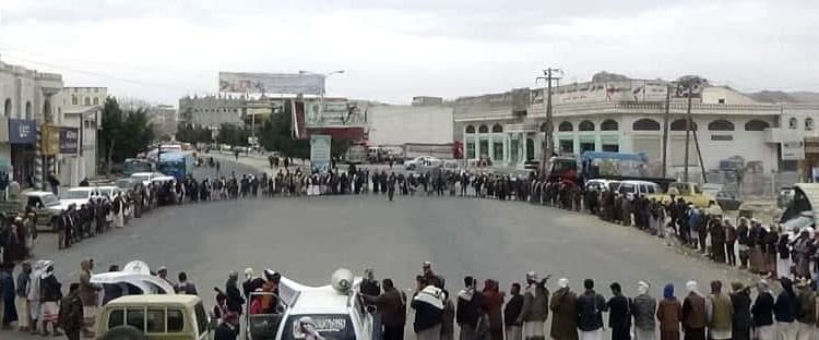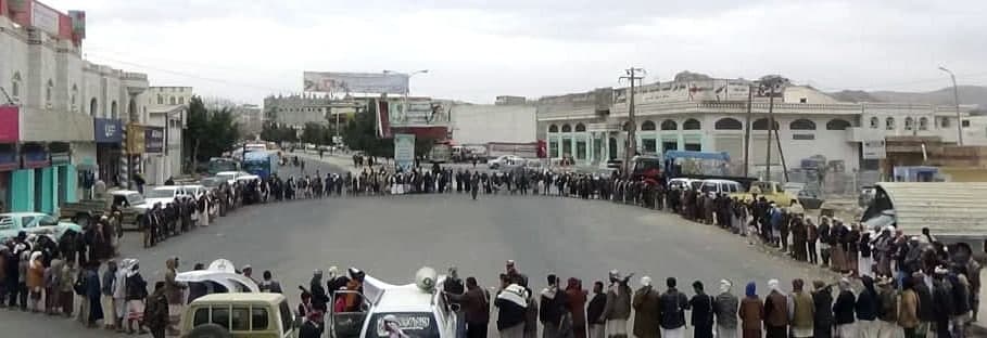 وأعلن البيان الصادر عن الوقفة الاحتجاجية تلاه علي الجلادي، النفير العام لرفد الجبهات بالرجال والمال والعتاد دفاعاً عن العرض والأرض.