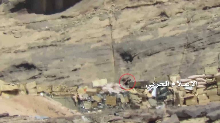 وتظهر المشاهد الجندي السعودي وهو يطل برأسه من موقع العش ويقوم بعملية الرصد لمحيط الموقع، بعدها صوب أحد قناصة الجيش اليمني واللجان الشعبية باتجاهه طلقة مسددة أدت إلى مصرعه على الفور.