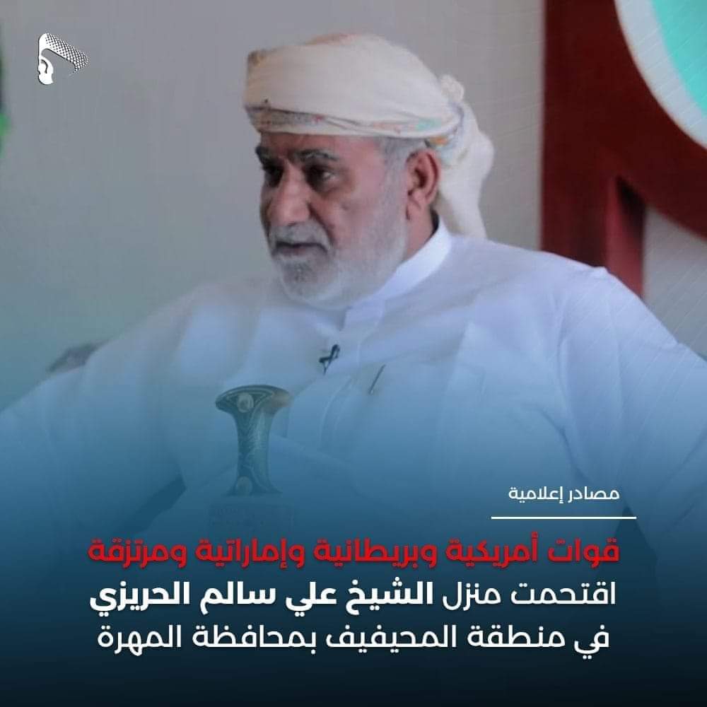 قوات تابعة لتحالف العدوان السعودي الاماراتي وبمعية قوات برطانية وأمريكية يقتحمون منزل الشيخ الحريزي في المهرة
