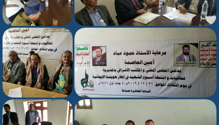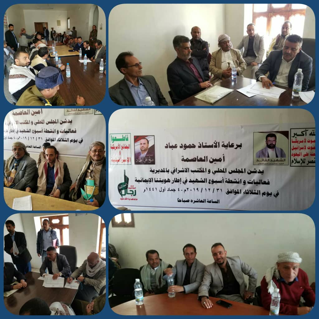 برعاية الأستاذ حمود محمد عباد أمين العاصمة دشن الأستاذ محمد محمد ناجي مدير عام المديرية رئيس المجلس المحلي والأستاذ سامي شرف الدين مشرف عام المديرية والأستاذ عبدالحميد الحرازي مساعد مدير عام المديرية والأستاذ محمد صالح الشعري رئيس لجنة التخطيط والمال والشيخ نبيل عبدالله المنعي رئيس لجنة الخدمات والعقيد لطف العوامي رئيس لجنة الشؤون الإجتماعية صباح يومنا هذا الثلاثاء الموافق 31 ديسمبر 2019م بديوان عام المديرية فعاليات وأنشطة أسبوع الشهيد في إطار هويتنا الإيمانية بعقد إجتماع بأعضاء السلطة المحلية ومدراء المكاتب التنفيذية بالمديرية .* *وخلال الإجتماع تم مناقشة مجمل المواضيع المتعلقة بالإعداد والتحضير والتجهيز لإقامة مختلف الفعاليات والأنشطة لإحياء ذكرى أسبوع الشهيد علي مستوى الحارات والاحياء وبمشاركة المكاتب التنفيذية وممثلي المكتب الإشرافي لإنصار الله بالأحياء والحارات .* *كم تم إستعراض واقرار خطة العمل المقدمة من قيادة المديرية والمجلس المحلي وتشكيل اللجان على مستوى المديرية والأحياء وتوزبع المهام عليهم لتبدأ بعد ذلك اللجان بتنفيذ مهامها وفق البرنامج الزمني للخطة .* وأكد *الأستاذ محمد محمد ناجي* على ضرورة إستشعار الجميع للمسئولية تجاه هذه الذكرى التي تجسد عظمة التضحيات والعطاء الذي قدمه شهدائنا العظماء وبذلهم لأرواحهم الطاهرة ودمائهم في سبيل كرامتنا وعزتنا ودفاعاً عن الدين والأرض والعرض ، لتكون تضحياتهم الغالية هي نقطة التحول في تعزيز الثبات والصمود وتصنع النصر الموزر بإذن الله تعالى وتحقق إنكسار وإنهزم لقوى الطغيان والعدوان الصهيوأمريكي السعودي الإماراتي الغاشم على بلادنا . ووجه *مدير عام المديرية رئيس المجلس المحلي* أعضاء السلطة المحلية ومدراء وموظفوا المكاتب التنفيذية والمشائخ والعقال والخطباء بالتفاعل القوي والجاد من أجل إقامة وتنفيذ وإنجاح كافة الفعاليات والأنشطة المختلفة التي سيتم تنفيذها على مستوى المكاتب والحارات والأحياء بالمديرية . وأشاد *الأستاذ سامي شرف الدين* بالتفاعل الكبير والرائع والمتميز الذي تقدمة قيادة المديرية والمجلس المحلي والمكاتب التنفيذية بالمديرية من أجل التحضير والمشاركة في الإعداد والتجهيز لإقامة الفعاليات والأنشطة الإحتفالية بذكرى أسبوع الشهيد والذي تمثل تجسيداً حقيقياً لهويتنا الإيمانية التي توجب علينا أن نعظم ونرفع قدر شهدائنا وأن نسير على دربهم ونقتدي بهم ، ومؤكداً بأن إحيائنا لذكرى الشهيد ليس مجرد فعاليات وأنشطة نقوم بها على إسقاط مسئوليتنا أو من أجل التغطية الإعلامية بل هي محطة تفرض على الجميع أن يقف أمامها بصدق ليستشعر عظمة وحجم التضحيات الكبيرة التي قدمها الشهداء والجرحى من أبناء الجيش واللجان الشعبية الذين كتبوا انصع الصفحات المشرقة في تاريخ اليمن الحديث .