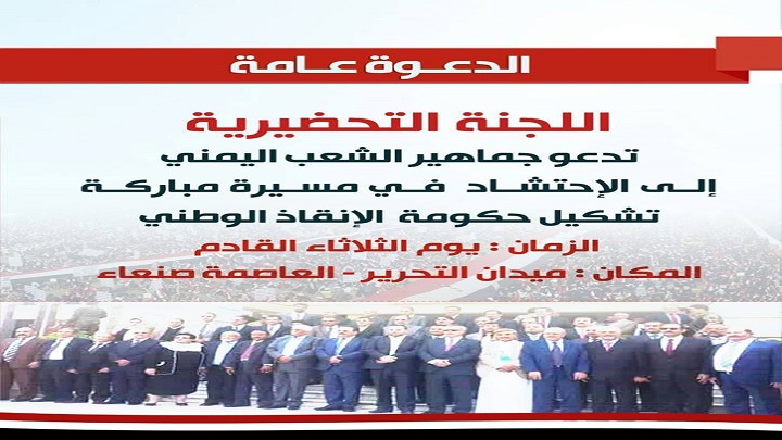 حددت اللجنة التحضيرية للفعاليات الجماهيرية عصر غد الثلاثاء موعدا للمسيرة الجماهيرية التي ستقام بميدان التحرير بالعاصمة صنعاء لتأييد ومباركة تشكيل حكومة الإنقاذ الوطني.