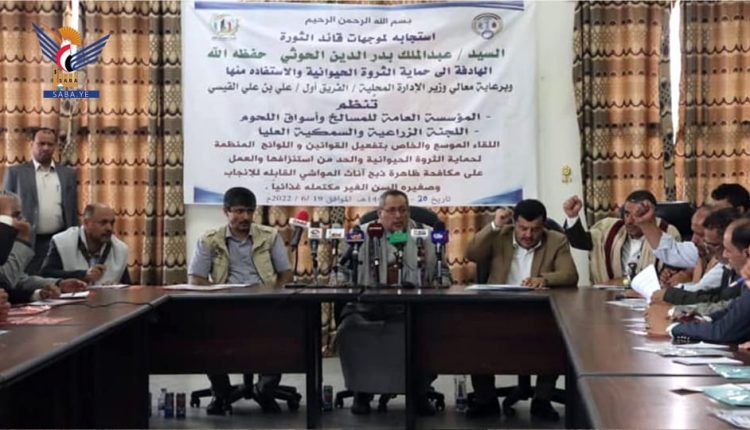 نظمت المؤسسة العامة للمسالخ وأسواق اللحوم واللجنة الزراعية والسمكية العليا اليوم لقاءاً موسعاً لتفعيل القوانين واللوائح المنظمة لحماية الثروة الحيوانية ومنع ذبح إناث المواشي القابلة للإنجاب وصغار السن غير المكتملة غذائياً.