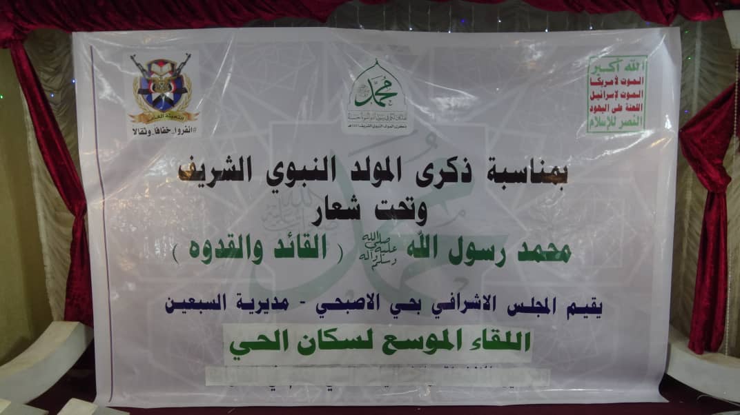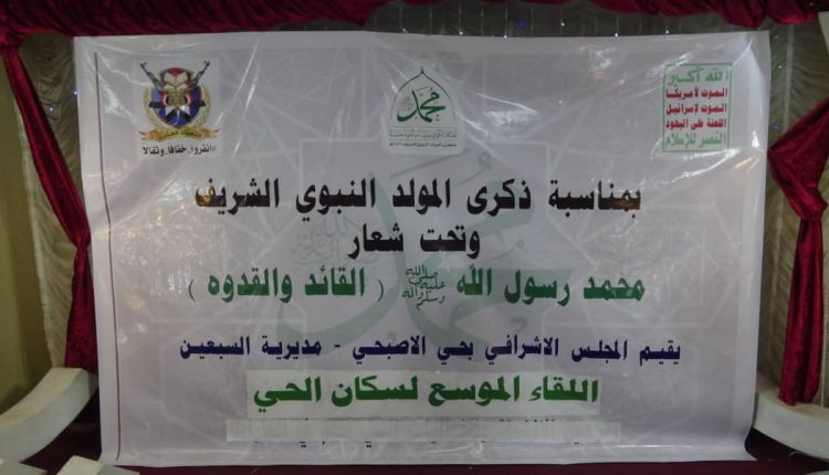 ابتهاجا بقدوم ذكرى الكولد النبوي وتحت شعار ( محمد رسول الله القائد والقدوة  )  نظم المجلس الأشرافي بحي الاصبحي بمديرية السبعين اليوم لقاء موسعا باللجان الحشد والوجهات والشخصيات الاجتماعية  بحضور عدد من الضيوف منهم معاون المشرف العام عبدالله سمينة   وقد تخلل اللقاء عدد من الكلمات  المعبرة عن اهمية الحشد من اليوم للفعالية المركزية واهمية دور اللجان التي شكلت في الأحياء للحشد.