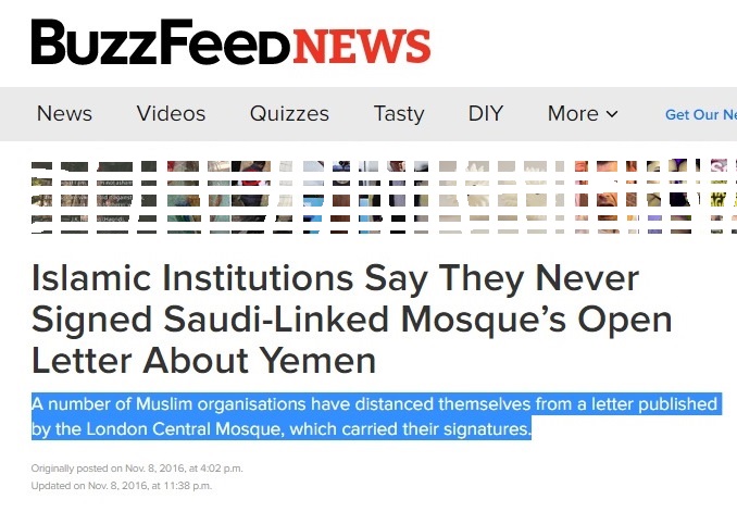 وكشف موقع (Buzz Feed News) البريطاني أن البريد الإلكتروني لوكالة الأنباء الرسمية السعودية تلقى رسالة من بريد مسجد لندن المركزي، الذي يقع في الريجنت ويضم منزل السفير السعودي بلندن كعضو في مجلس أمناء المسجد، تحوي بياناً مصادقاً عليه من قبل 16 مسجد ومؤسسات إسلامية كبرى في لندن.