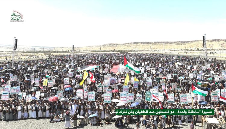 وأكد المشاركون في المسيرات أن الشعب اليمني لن يتخلى عن أي جبهة من جبهات محور الجهاد والمقاومة ولن يترك فلسطين ولا لبنان.