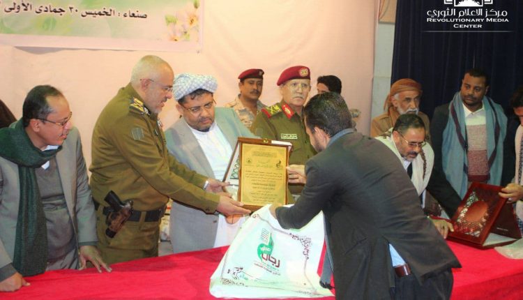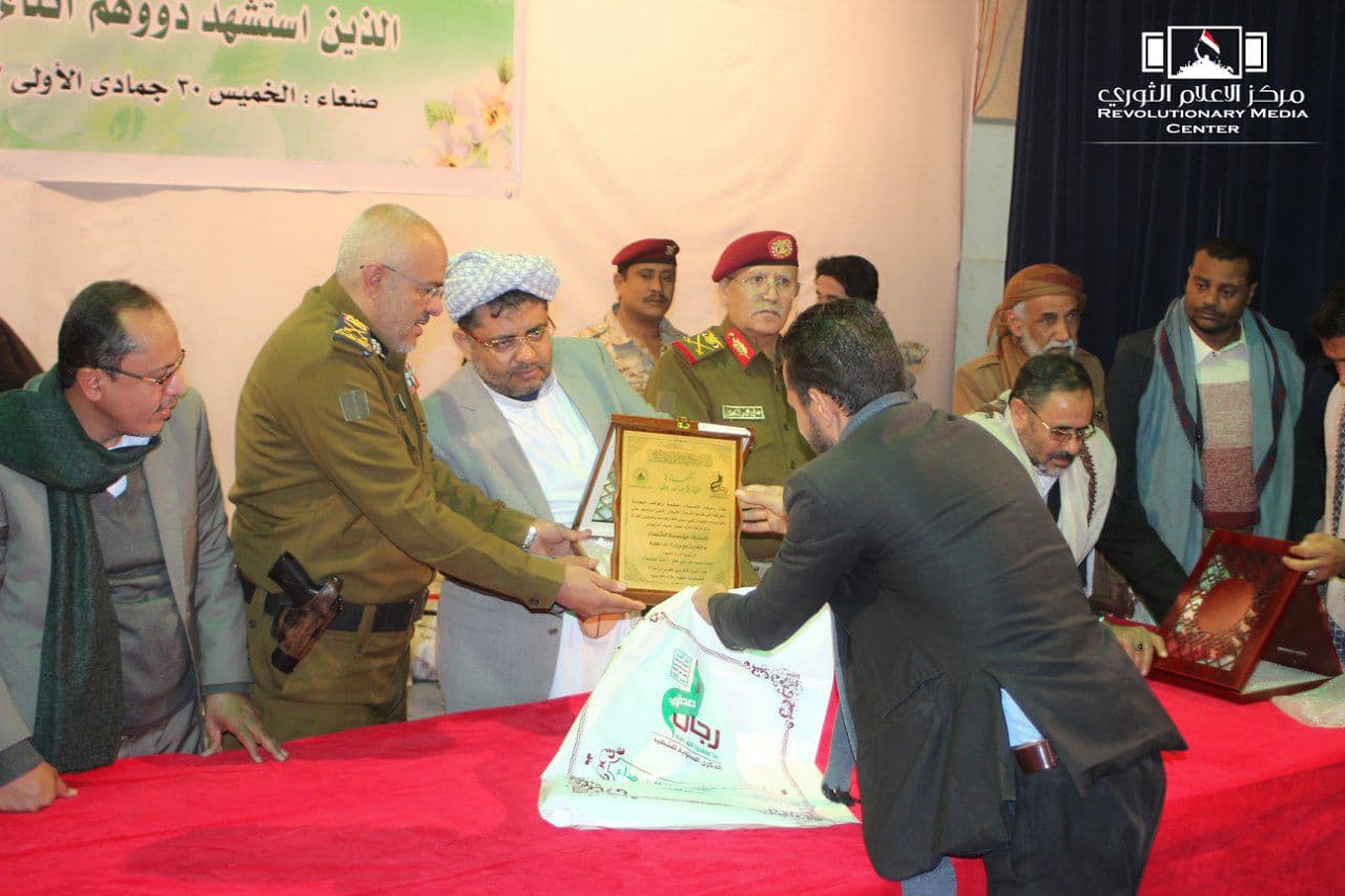 وفي ختام الحفل الذي تخلله قصيدة للشاعر عبدالباري عبيد بعنوان “مواقف مشرفة” كرم عضو السياسي الأعلى الحوثي ومساعد وزير الدفاع ووكيل وزارة الداخلية ونائب المدير التنفيذي لمؤسسة الشهداء، أسر الشهداء بدروع وهدايا عينية.