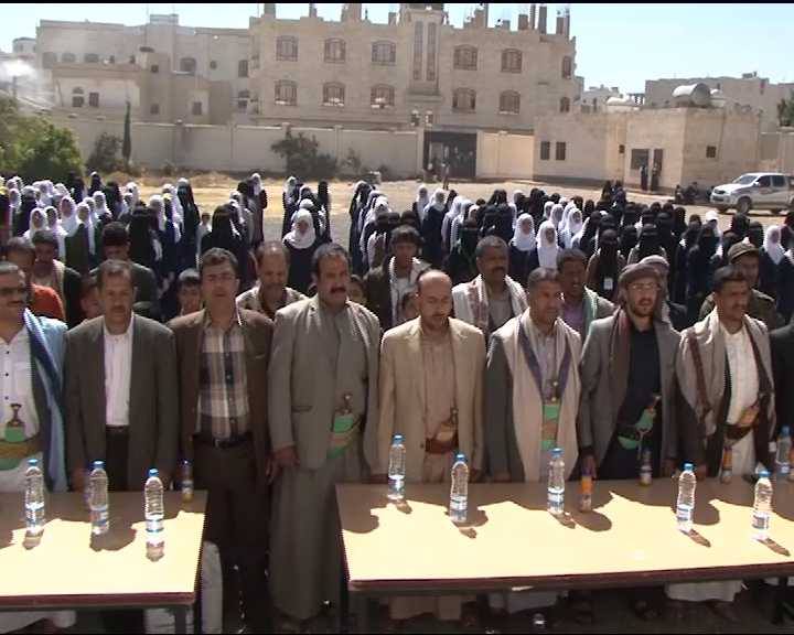 الوقفة حضرها عدد من أولياء الأمور ومكتب التربية بالمنطقة، ورفعت الطالبات خلالها لوحات وصور تُظهر جانبا من مجازر العدوان بحق اليمنيين.