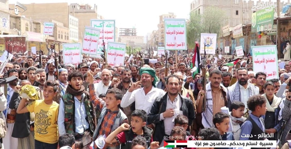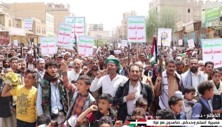 ورفع المشاركون في المسيرة بمديرية دمت، التي تقدّمها القائم بأعمال محافظ الضالع عبداللطيف الشغدري ومساعد قائد المنطقة العسكرية الرابعة العميد صالح حاجب العلم الفلسطيني، مؤكدين استمرار التعبئة والتحشيد وإقامة المسيرات والمظاهرات والوقفات مع الشعب الفلسطيني حتى تحقيق النصر.