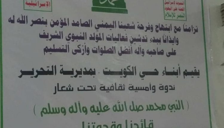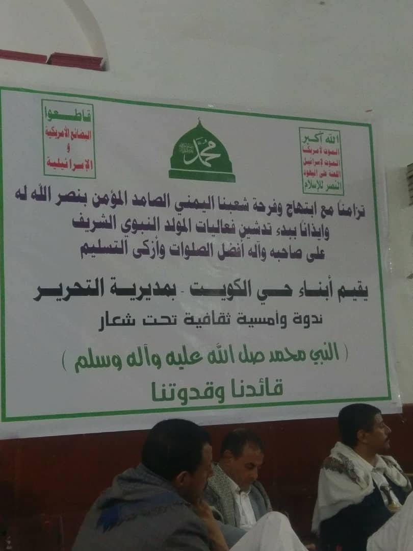 تزامنآ مع ابتهاج وفرحة شعبنا اليمني الصامد المؤمن بنصر الله له وايذانآ ببدء تدشين فعاليات المولد النبوي الشريف في الاحياء والحارات لمديرية التحرير. اقام ابناء حي الكويت مساء اليوم ندوة بمناسبة المولد النبوي بين صلاتي المغرب والعشاء وقد تطرق فيها المتحدثين عن حياة الرسول قبل الرسالة ومن بعد الرسالة. وبعد صلاة العشاء اقيمة امسية عن هذة المناسبة بدأت بالقران الكريم للاستاذ فيصل الشرفي وبعد القران الكريم عرض فلاشة عن الاحتفالات السابقة ومن بعدها قدمت فرقة 21من سبتمبر اوبريت فني حول مناسبة المولد وحول مواجهه العدوان والقاء الاستاذ عبد الله الهادي كلمة الضيوف وبعدها تم عمل مسابقة حول مناسبة المولد الشريف.