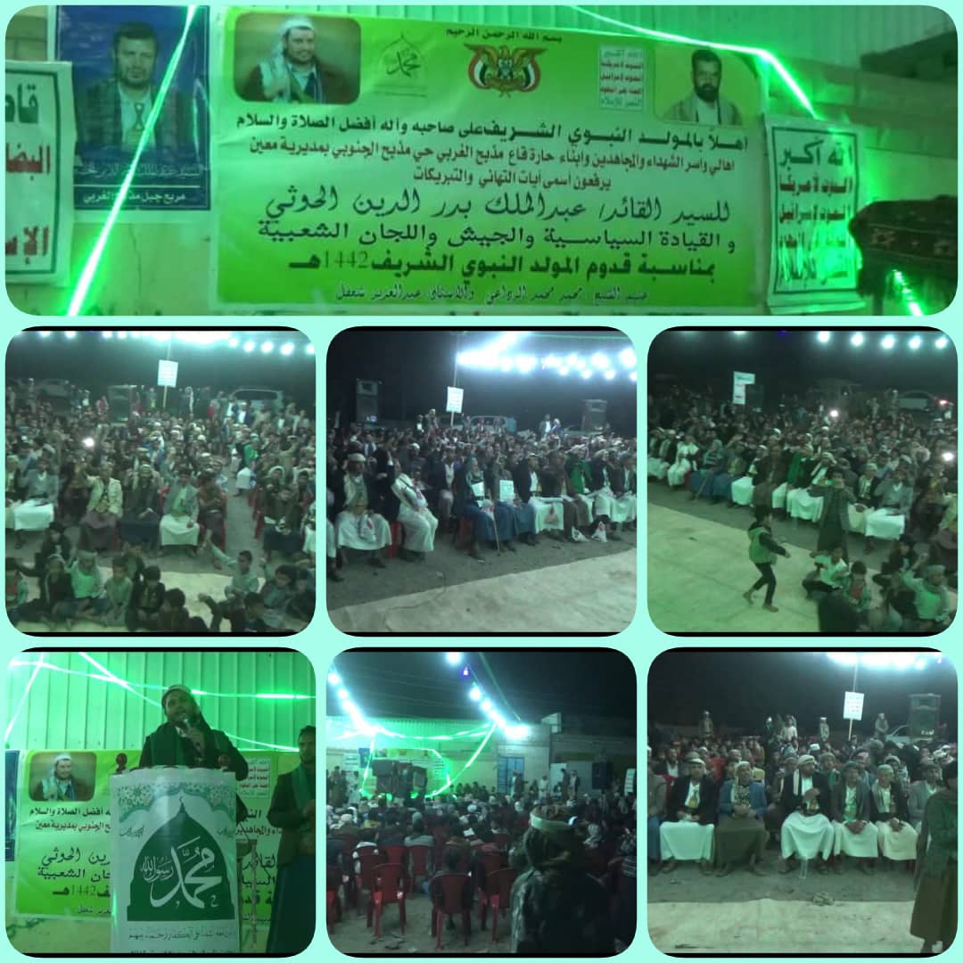 فرحا وإستبشارا بمولد النور والضياء، تتواصل أمسيات المولد النبوي الشريف بمديرية معين بالأمانة،حيث أقيمت الأمسيات بحارة الخطيب بحي السنينة الجنوبية وحارتي علي بن ابي طالب والنصر بحي القبة وحارة بير السري بحي الدائري وحارة قاع مذبح بحي مذبح الجنوبي وحارة أرض الجنتين بحي عصر ومربعات الستين والنور والمقداد والسد والرحمن بحي مذبح الشمالي وشملان.