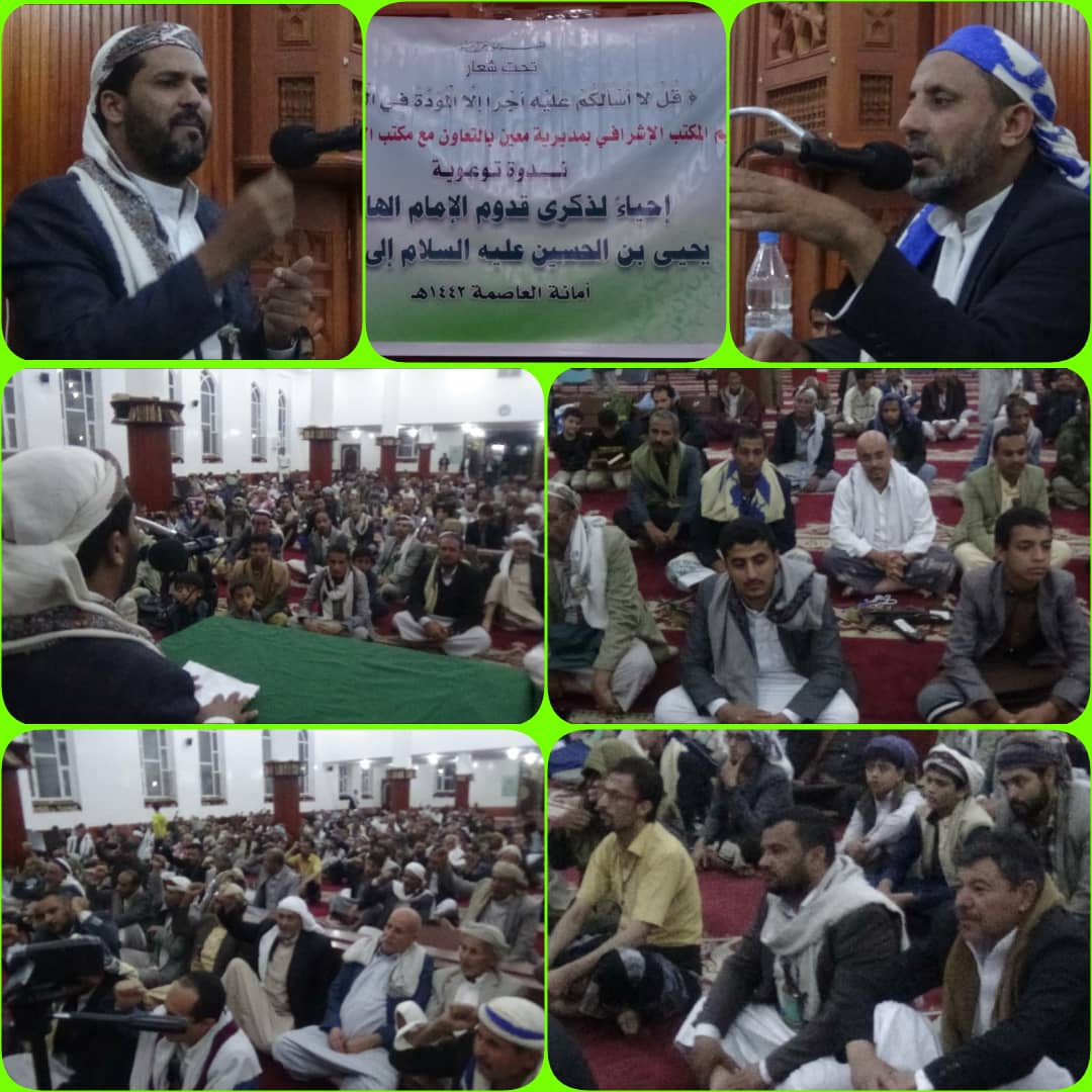 نظم المكتب الإشرافي لأنصار الله بمديرية معين بأمانة العاصمة مساء اليوم، ندوة ثقافية وتوعوية مركزية إحياءا لذكرى القدوم المبارك للإمام الهادي يحي بن الحسين عليه السلام إلى اليمن.