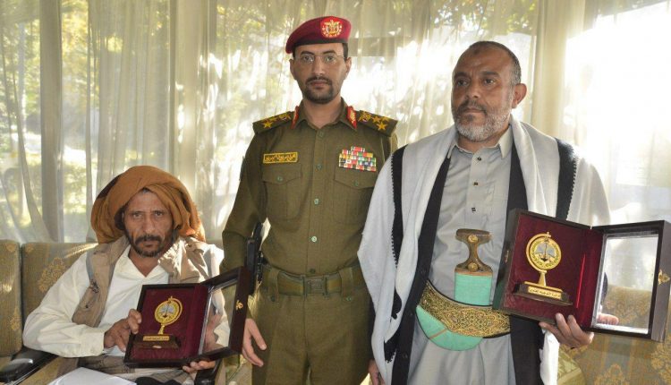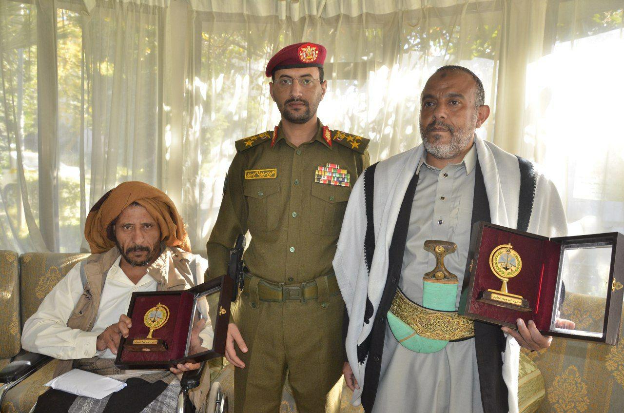 كرم مدير دائرة التوجيه المعنوي – المتحدث الرسمي باسم القوات المسلحة العميد يحيى سريع اليوم بصنعاء الأسيرين المحررين من منتسبي دائرة التوجيه المعنوي الأسير الجريح علي الكاظمي والأسير إسماعيل لقمان بدرع دائرة التوجيه المعنوي تقديراً لهما واعتزازاً بمواقفهما البطولية الشجاعة. وخلال الفعالية أشاد العميد سريع بثبات وشجاعة الأسيرين الكاظمي ولقمان وزملائهما وما سطروه من ملاحم بطولية في ميادين العزة والكرامة وهم يواجهون المعتدين ويلقنونهم الهزائم تلو الهزائم .. مؤكدا الاهتمام بالجريح الكاظمي وتقديم كافة أوجه الدعم حتى يتماثل للشفاء. واستنكر العميد سريع المعاملة اللاأخلاقية واللاإنسانية التي تعامل ويتعامل بها العدوان مع الأسرى وعدم احترامهم ومراعاتهم للقيم الأخلاقية والإنسانية والأعراف والقوانين الدولية.