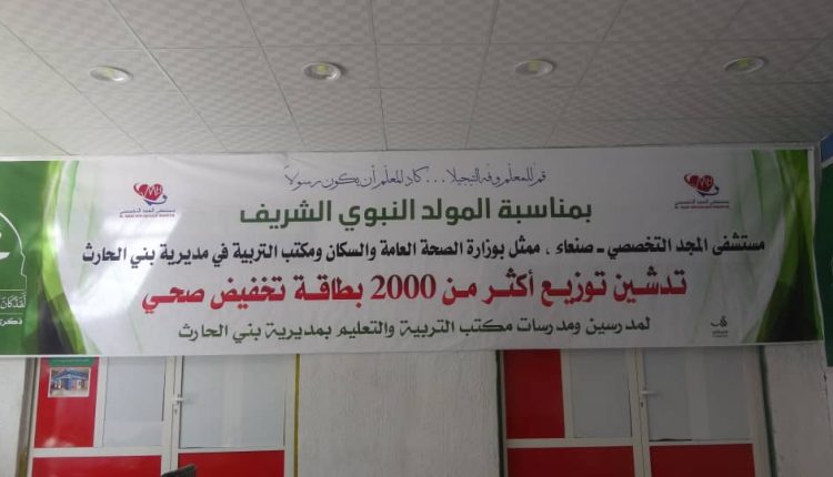 مستشفى المجد التخصصي بمديرية بني الحارث يدشن فعاليات المولد النبوي الشريف ويمنح 2000 معلم بطاقة صحية بمناسبة المولد