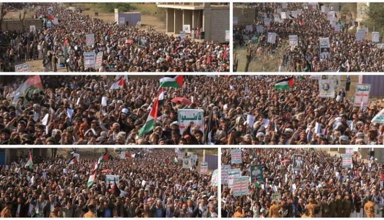 إلى ذلك نُظمت بمديرية مقبنة بتعز، مسيرة جماهيرية حاشدة في ساحة الكمب، تضامناً مع الشعب الفلسطيني ومحور الجهاد والمقاومة بقطاع غزة.