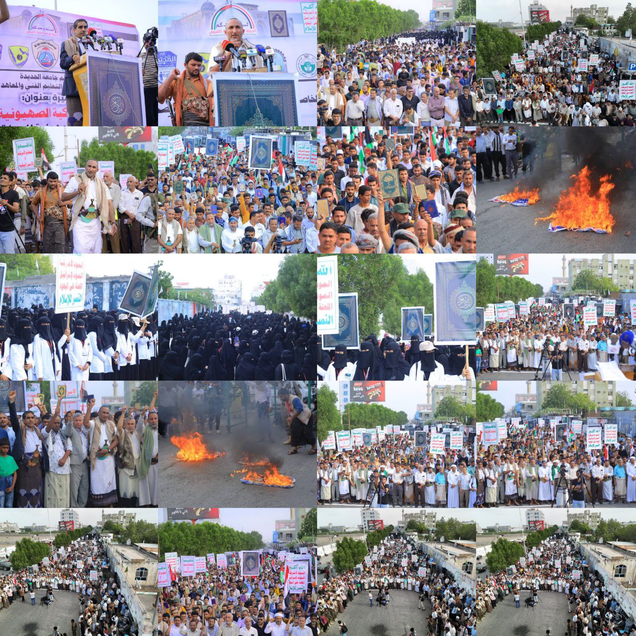 وردد المشاركون في المسيرات هتافات غاضبة عبّرت عن الرفض القاطع لهذه الإساءات.. مؤكدين أن القرآن الكريم خط أحمر، وأن المساس به يُعد اعتداءً سافرا على عقيدة أكثر من ملياري مسلم في العالم.. مؤكدين تمسكهم بالهوية الإيمانية والثقافة القرآنية، واعتزازهم بالانتماء لكتاب الله، ورفضهم المطلق لكل محاولات التشويه والاستفزاز.