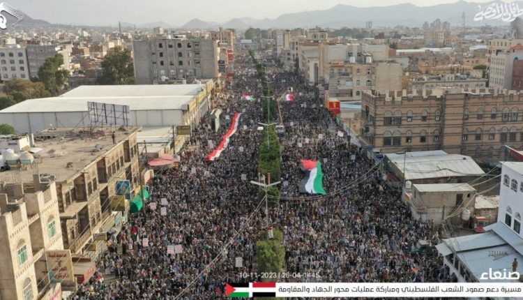 واحتشد عشرات الآلاف في شارع المطار بالعاصمة صنعاء الذين تقاطروا من كل الأحياء والحارات، حاملين الأعلام الفلسطينية واللافتات المؤكدة على مساندة الشعب اليمني ودعمه الكامل والمستمر للشعب الفلسطيني ومقاومته الباسلة ومباركته لعملية “طوفان الأقصى” حتى تحقيق النصر ودحر الاحتلال الصهيوني.