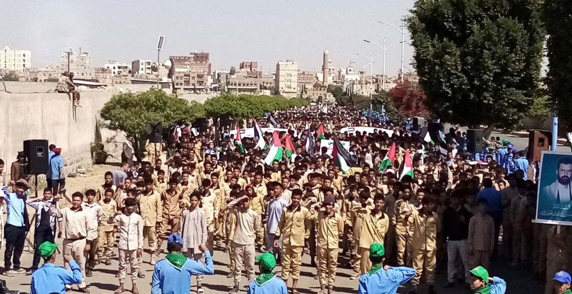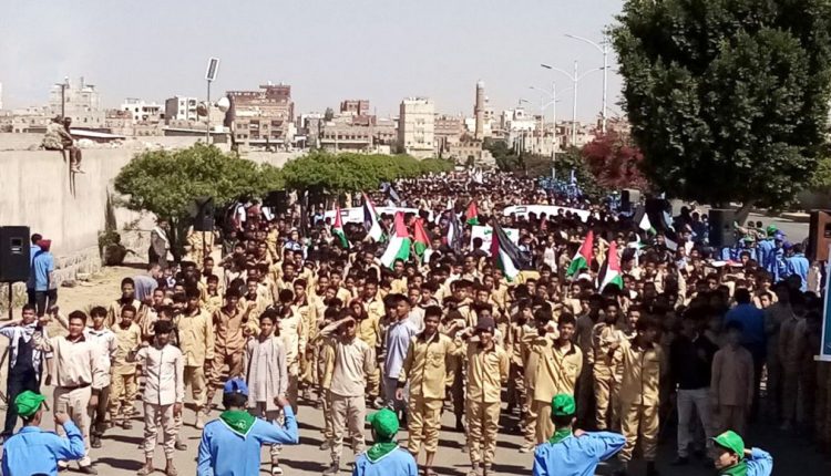 ورفع طلاب المدارس الأعلام الفلسطينية واليمنية، ورددوا الشعارات المؤيدة والمساندة للمقاومة الفلسطينية في مواجهة العدو الصهيوني الغاصب، وتضامنهم ودعمهم الكامل للشعب الفلسطيني حتى تحرير كامل أرض فلسطين.
