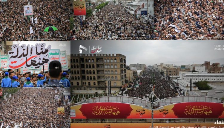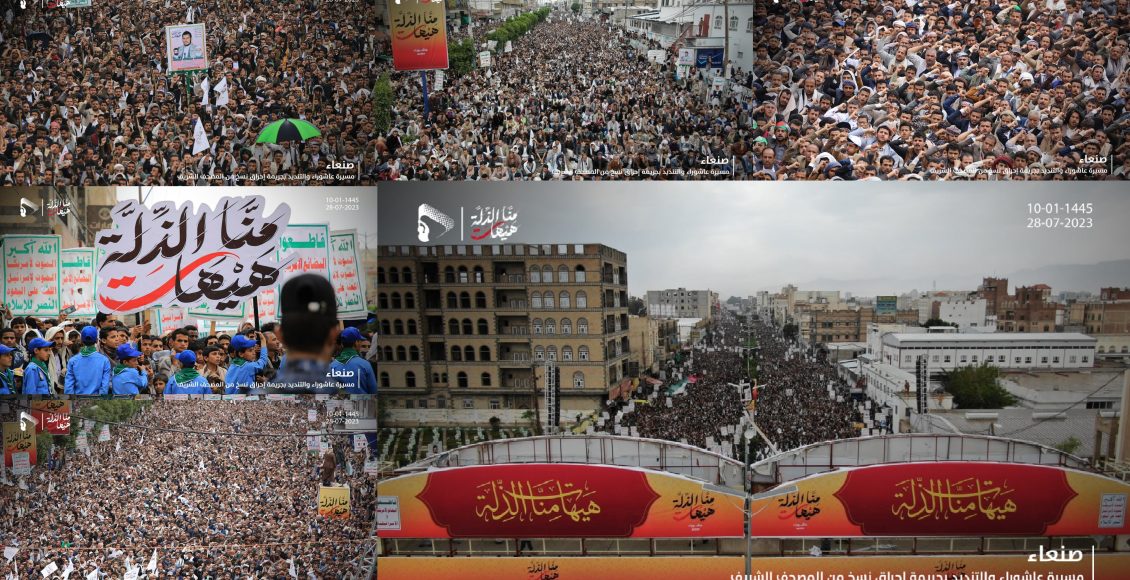 شهدت العاصمة صنعاء، عصر اليوم، مسيرة جماهيرية كبرى إحياءً لذكرى استشهاد الإمام الحسين عليه السلام “عاشوراء” وتنديداً بالإساءة للقرآن الكريم تحت شعار “هيهات منا الذلة”.