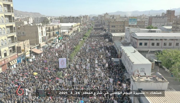 شهدت العاصمة صنعاء، عصر اليوم الجمعة، مسيرة جماهيرية كبرى في الذكرى السنوية السادسة للصمود في وجه العدوان الأمريكي السعودي الإماراتي ، تأكيدا على استمرار حالة النفير ورفد الجبهات والثأر للدماء المسفوكة ظلما.