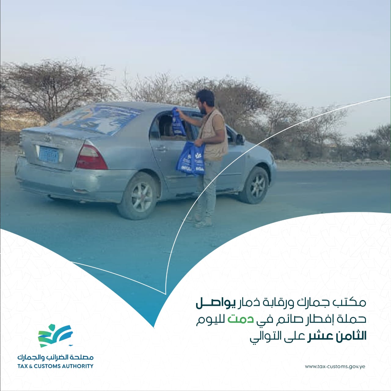 يواصل مكتب جمارك ورقابة ذمار تنفيذ حملة إفطار صائم في منطقة دمت بمحافظة الضالع، وذلك لليوم الثامن عشر على التوالي، ضمن الأنشطة الخيرية والاجتماعية التي ينفذها موظفو المكتب خلال شهر رمضان المبارك.
