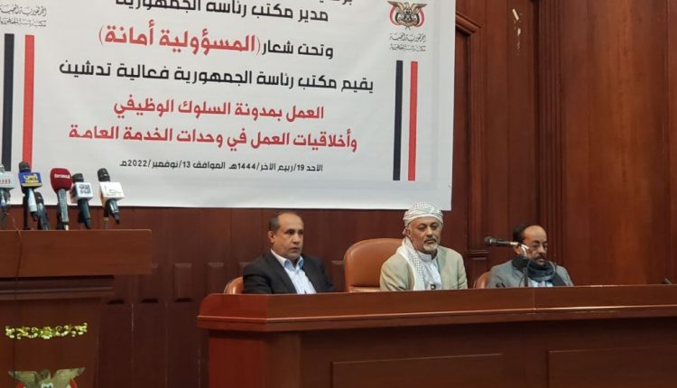 وفي التدشين، الذي حضره رئيس مجلس الشورى محمد العيدروس ونائبه عبده الجندي وأمين سر المجلس السياسي الأعلى الدكتور ياسر الحوري ونائب مدير مكتب الرئاسة فهد العزي ورئيس هيئة رفع المظالم الدكتور عبد الملك الأغبري وعدد من المسؤولين ورؤساء الدوائر في مكتب الرئاسة، قدّم رئيس دائرة الشؤون المالية والإدارية، توفيق أبو هادي، عرضا موجزا عن مدوّنة السلوك وأهدافها، وما تضمنته من نصوص تعزز وتقوي روح الولاء لله -عز وجل- ولرسوله الكريم، وتحسن وتسهل تقديم الخدمات للمواطنين.