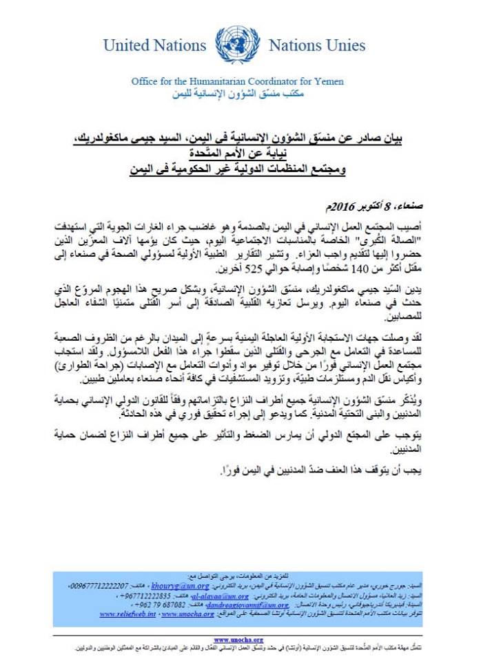 أدان منسق الشئون الانسانية في اليمن جيمي ماكغولدريك الجريمة المروعة التي ارتبها العدوان السعودي الامريكي واستهدف صلة عزاء في العاصمة صنعاء مكتضة بالمواطنين.