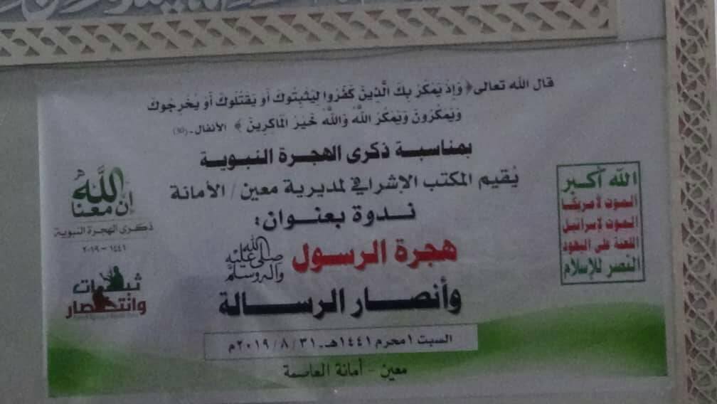 بمناسبة ذكرى الهجرة النبوية على صاحبها وآله الصلاة والسلام نظم المكتب الإشرافي بمديرية معين مساء يومنا هذا السبت2019-8-31م ندوة بعنوان ” هجرة الرسول وأنصار الرسالة “