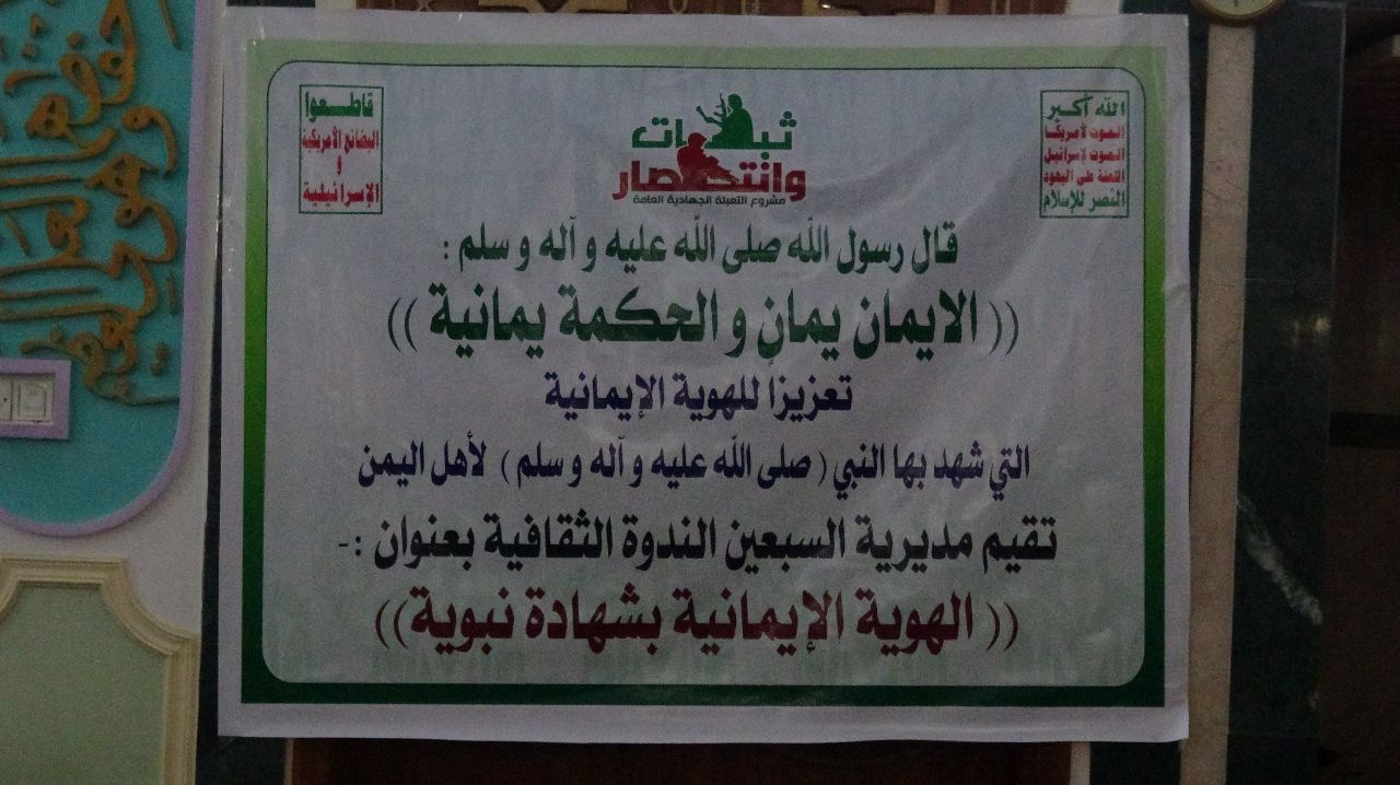 تحت شعار ( الايمان يمان والحكمة يمانية ) وتم تدشين فعاليات وأنشطة حملة الهوية الإيمانية وذلك للحد من الحرب الناعمة التي يستخدمه العدوان لافسادنا واهالينا ومجتمعنا اليمني المسلم وقد الفيت عدد من كلمات المعبرة عن مدى ارتباط اليمنين بالايمان حضر، الندوة خالد المداني عضو مجلس الشورى والعلامة مهدي العطاني عضور رابطة علماء اليمن ومحمد الوشلي ندير، عام مديرية السبعين وجميع غفير من ابناء المديرية .