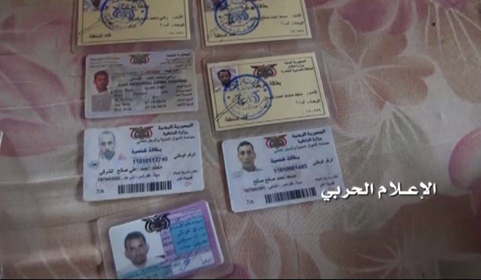 وتظهر الصور هويات عسكرية وشخصية لستة من قتلى مرتزقة الجيش السعودية تم العثور على جثثهم في مناطق الاشتباك في صحراء مديرية ميدي.