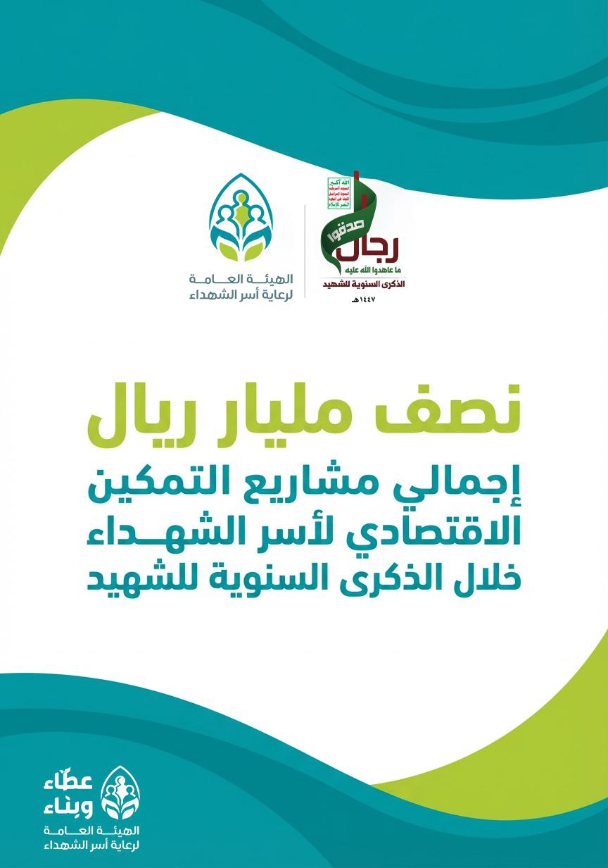 نفذ قطاع التخطيط والتنمية بالهيئة العامة لرعاية أسر الشهداء بالتزامن مع الذكرى السنوية للشهيد 1447هـ عددا من مشاريع التمكين الاقتصادي لأسر الشهداء بتكلفة 500 مليون ريال.