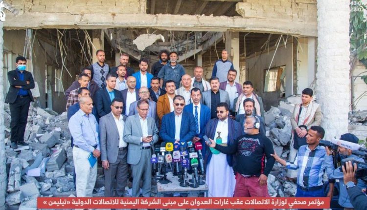 وزارة الاتصالات تعقد مؤتمراً صحفياً على أنقاض مبنى تيليمن المستهدف من قبل طيران العدوان