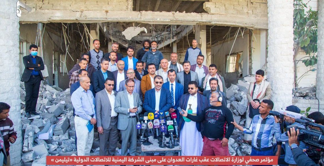 وفي المؤتمر الصحفي أوضحت وزارة الاتصالات أن مبنى تيليمن المستهدف من قبل طيران تحالف العدوان ليل أمس يحتوي على التجهيزات الفنية والأساسية لتقديم خدمات الاتصالات الدولية والإنترنت.. مشيرة إلى أن الاستهداف أسفر عن تدمير كلي لكافة التجهيزات الفنية والمبنى و انقطاع خدمات الاتصالات الدولية.